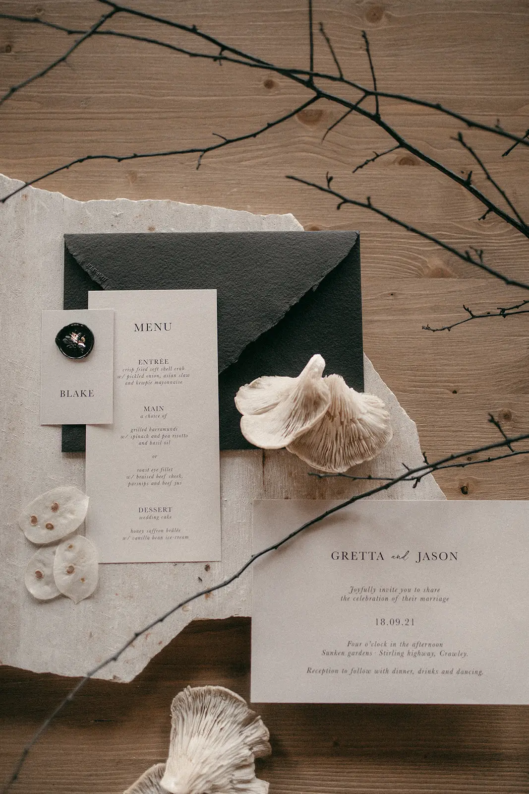 La papelería tiene mucha importancia, aunque no llegue al nivel de las flores, está cerca. Son las piezas con las que los invitados interactúan directamente, como los menús o el seating plan. El tipo de papel, los colores y la tipografía elegidos pueden reflejar perfectamente los valores del evento y la personalidad de los novios. Además, muchas veces estas piezas se convierten en recuerdos que los invitados se llevan a casa.